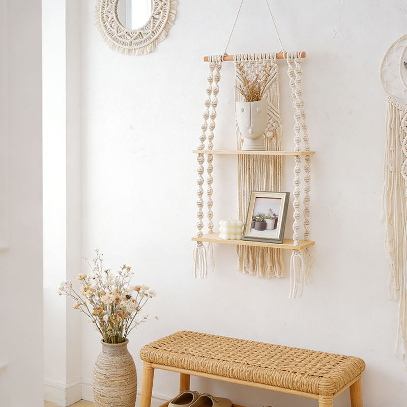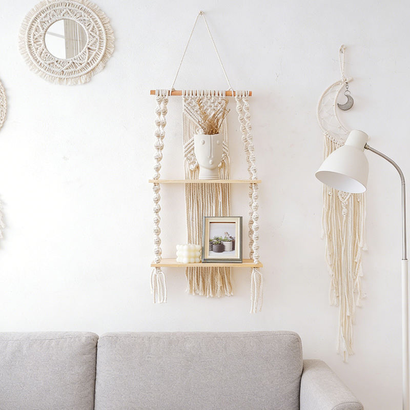 Scaffale Moderno in Stile Bohemien per Libri e Piante, Portaoggetti da Parete in Legno e Tessuto Intrecciato a Mano per B&B e Soggiorno