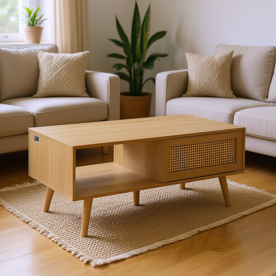 Tavolino da Caffè in Rattan Stile Boho Moderno 42 Pollici con Struttura in Legno e Due Ripiani Portaoggetti per Soggiorno