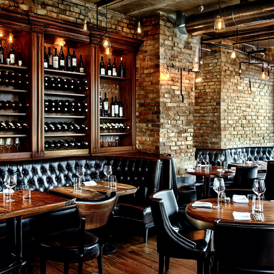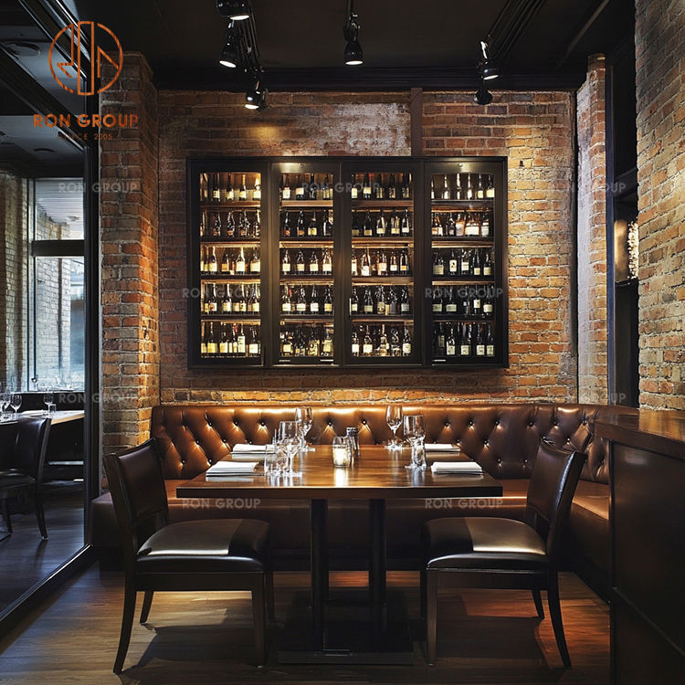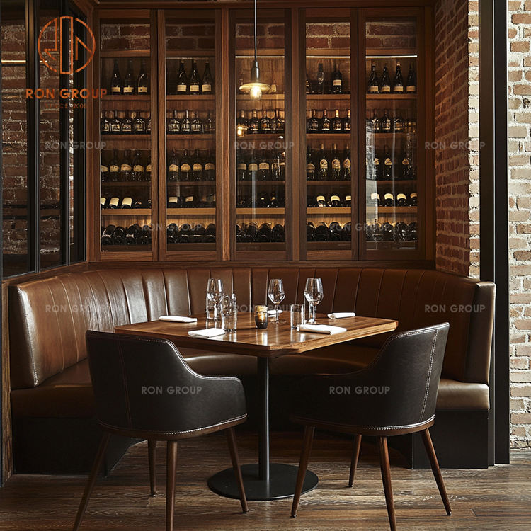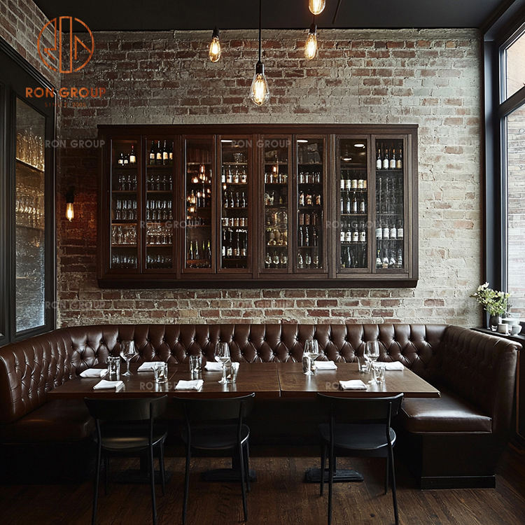 Modern Cafe Coffee Shop Restaurant Furniture Set Brown Leather Booth with Classic Stitch Design and Solid Wood Dining Tables
