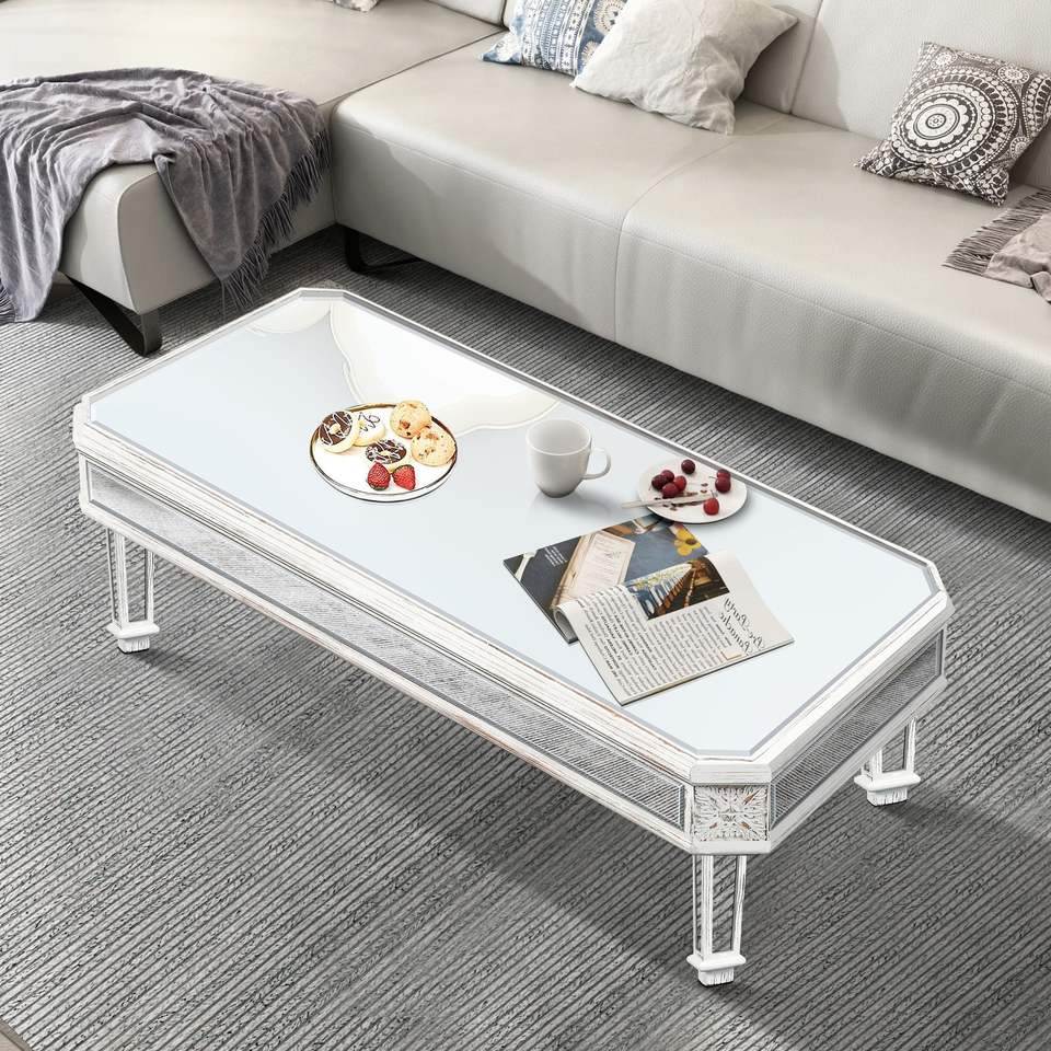 Tavolino da Centro Moderno con Finitura a Specchio Argento, Tavolo da Tè Rettangolare in Vetro con Elementi Intagliati Vintage, Tavolino da Caffè