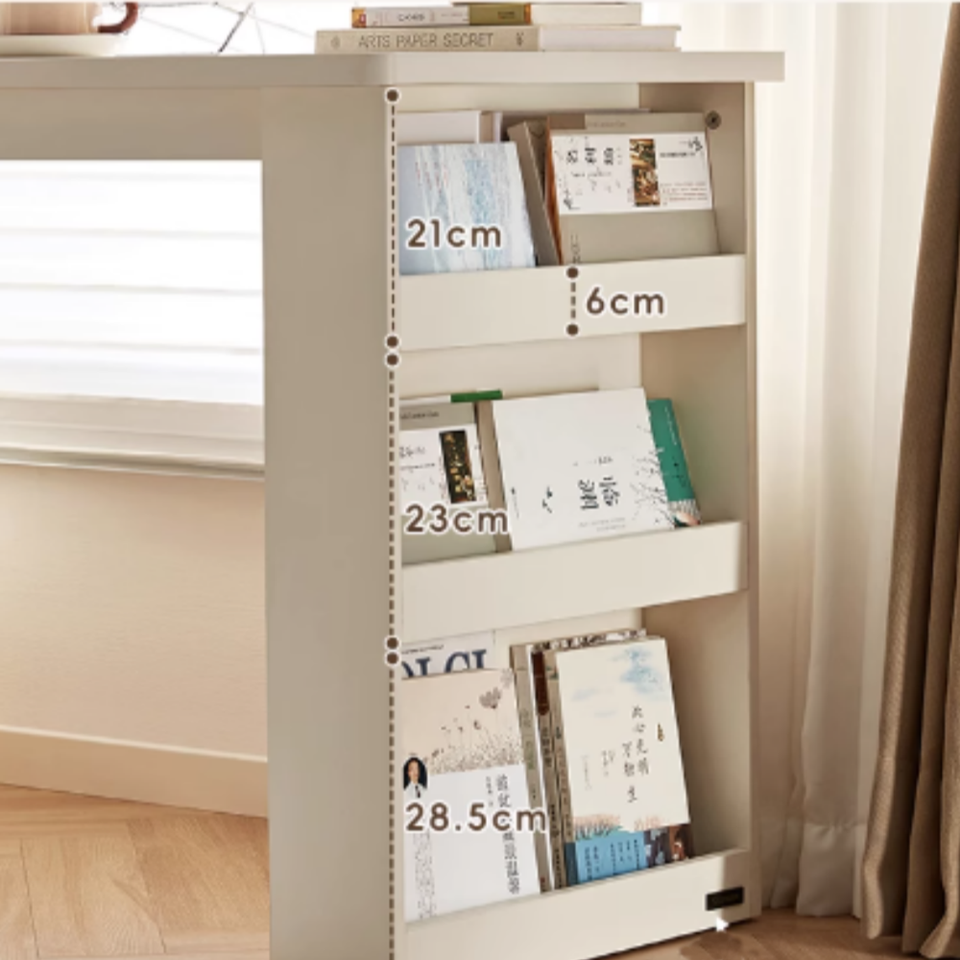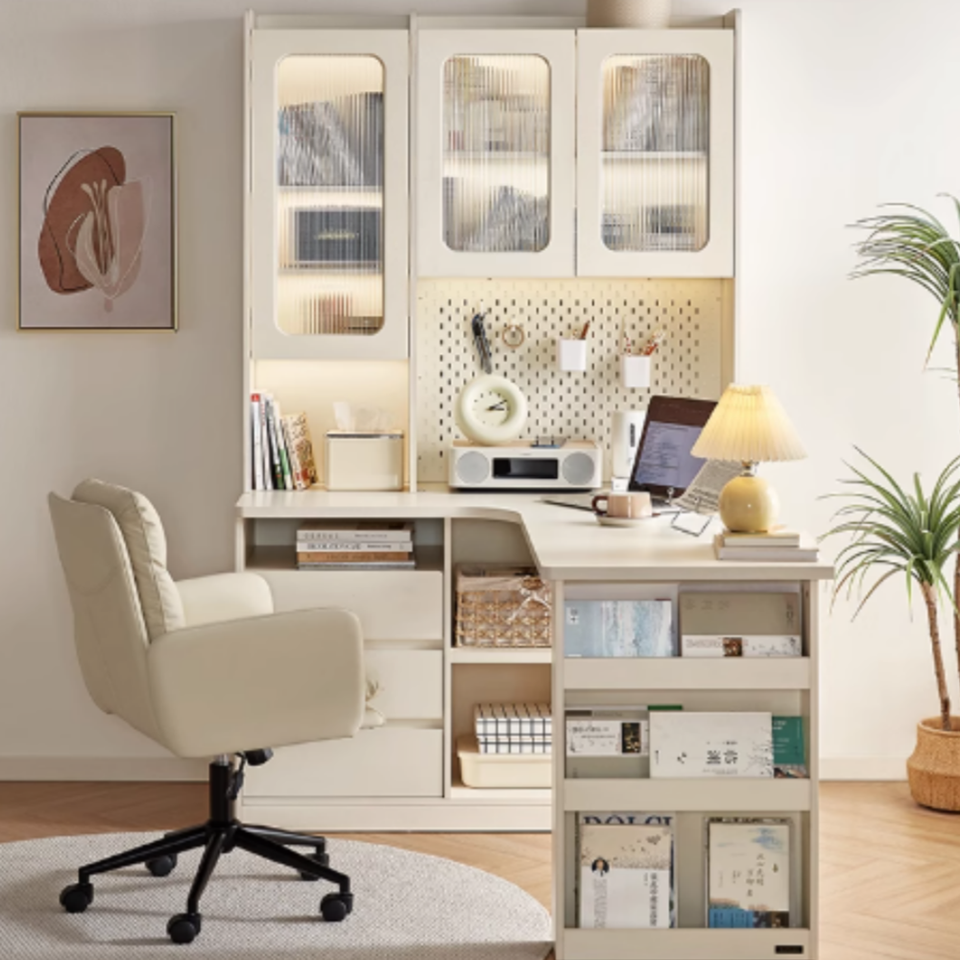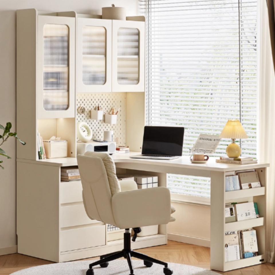 Scrivania Angolare Moderna in Legno Massello Stile Crema con Libreria Integrata per Camera da Letto e Studio, Design Unico per Soggiorno