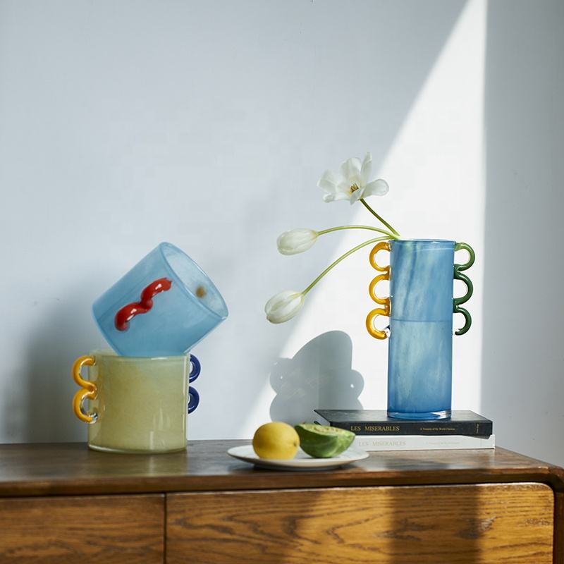 Vaso in vetro soffiato a mano dal Design cilindrico moderno con colori marmorei vivaci manici ad anello artistici decorazioni per la casa vaso da tavolo