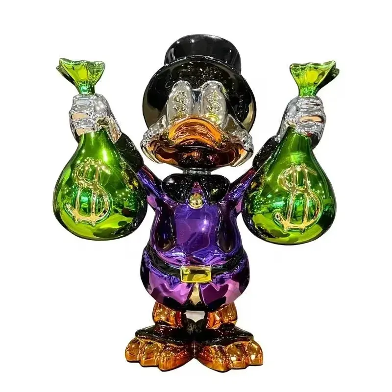 Statua di Paperino in Stile Pop Art Moderno, Scultura in Resina Personalizzata con Due Bottiglie, Finitura Dorata in Fibra di Vetro