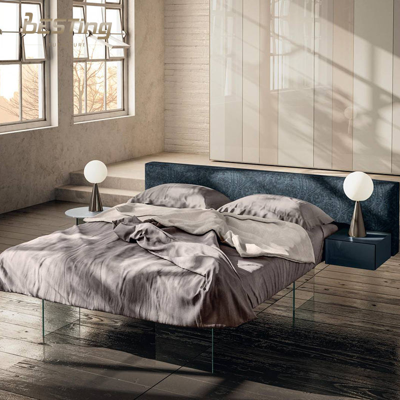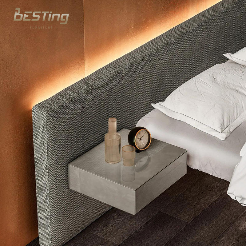 Letto matrimoniale moderno con testiera in tessuto plissettato orizzontale delicato con luce notturna a LED grandi letti levitanti