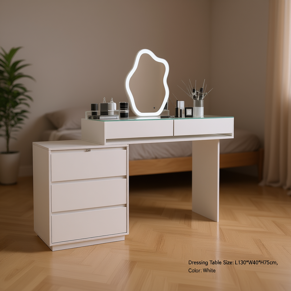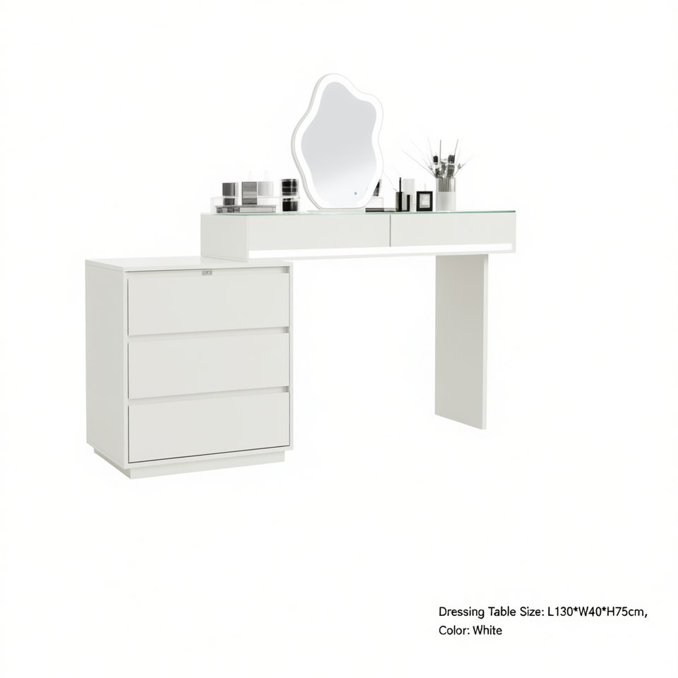 Toeletta moderna bianca L130xP40xH75cm con specchio illuminato per camera da letto