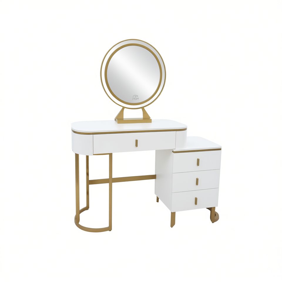 Toeletta moderna con specchio e cassetti portaoggetti per camera da letto, finitura bianca e oro