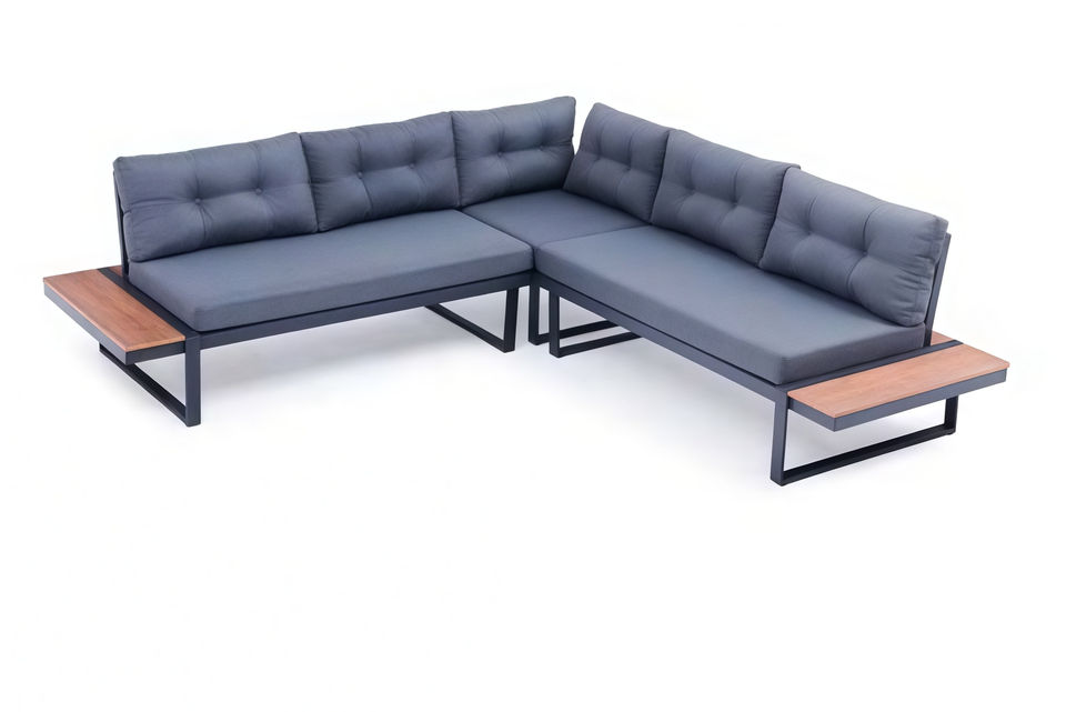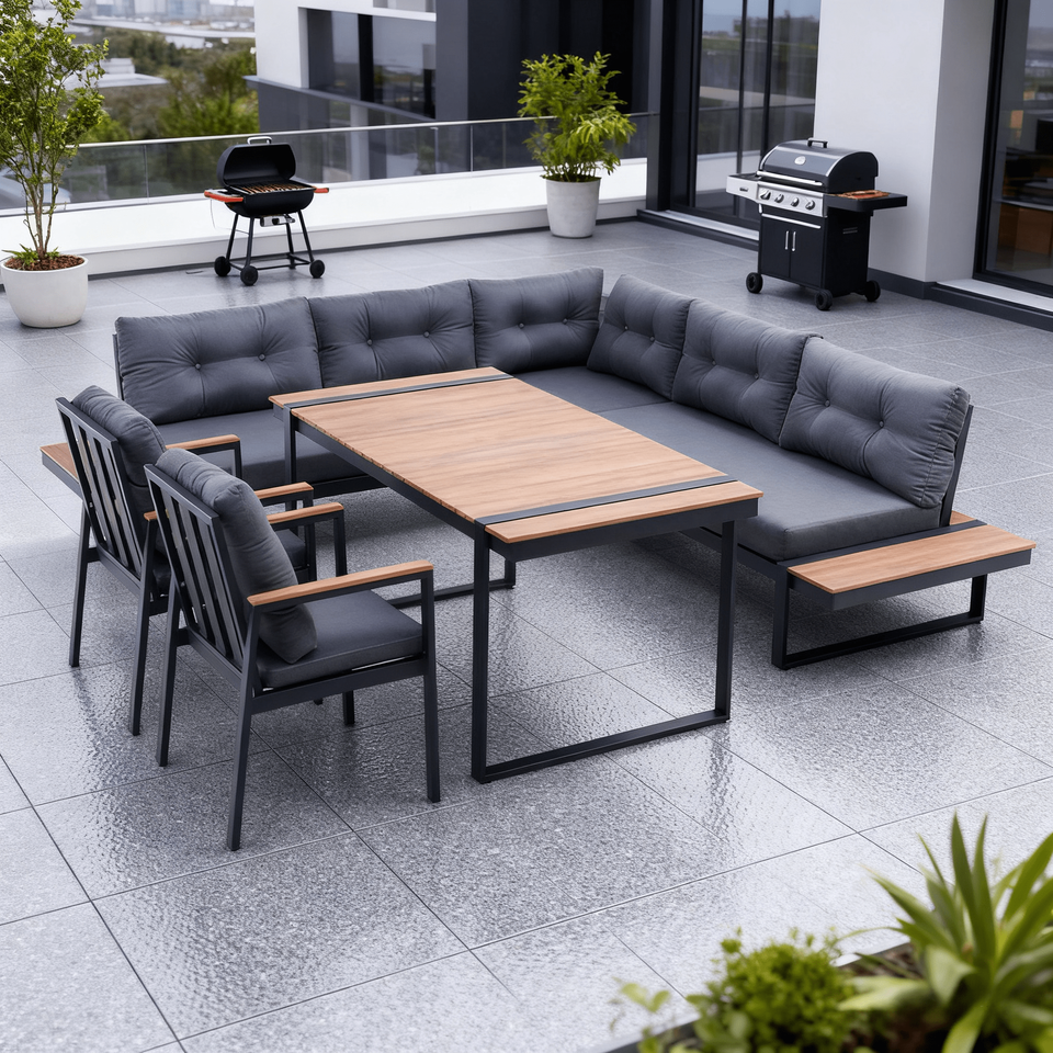 Set di Mobili da Esterno Moderni e Durevoli, Divano Componibile Grigio, Tavolo in Legno Plastico, Sedie in Alluminio per Giardino, Sala da Pranzo e Soggiorno