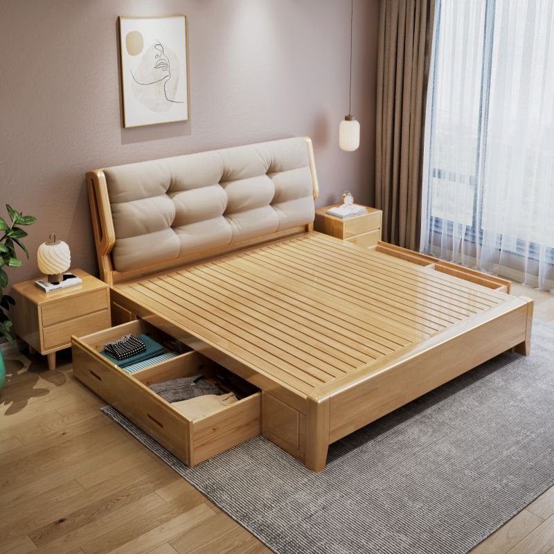 Modern European Design King Size Solid Wood Bed Frame Double Bedroom Storage Fabric Log Wood Bedroom Furniture Soft Bed