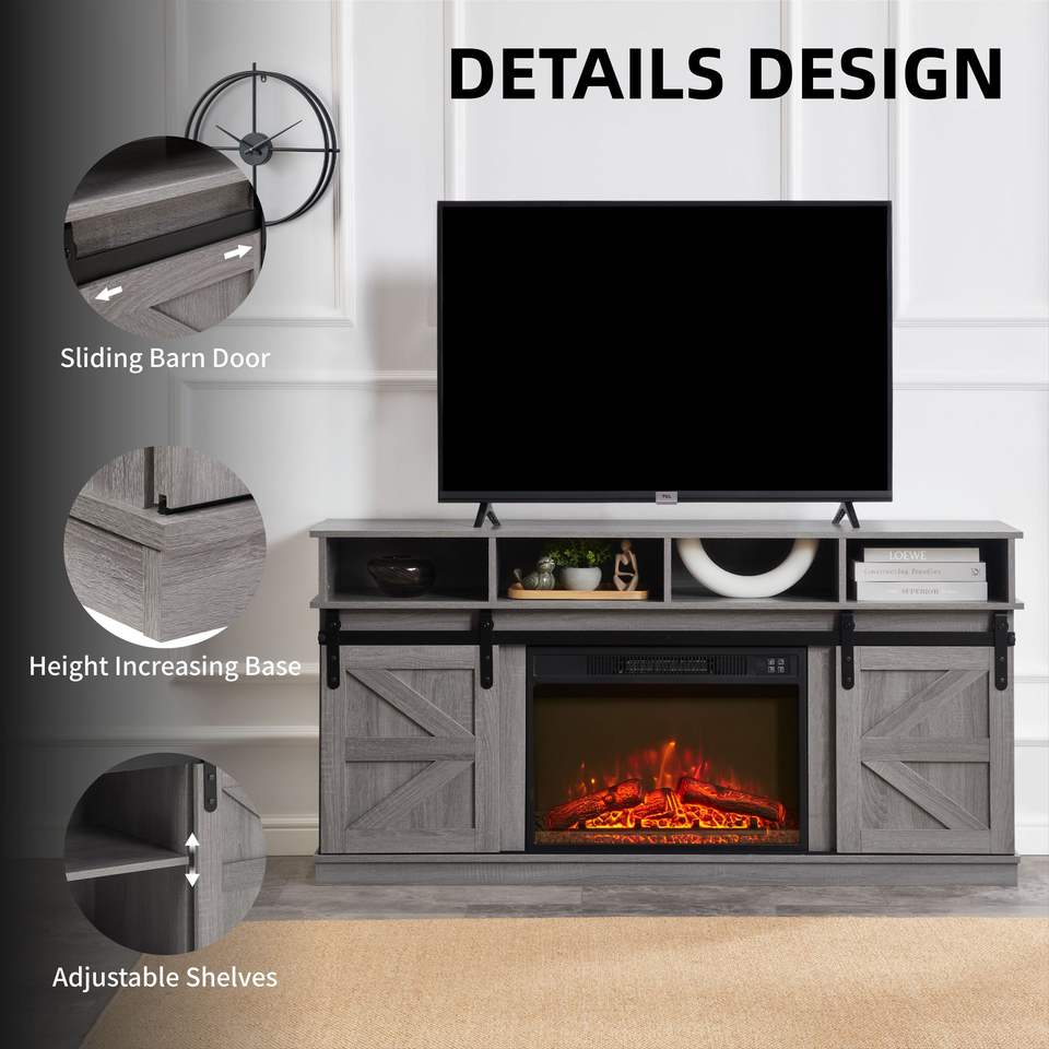 Mobile TV Moderno Stile Fattoria, Grande Consolle per Intrattenimento Domestico Ispirata ai Fienili con Inserto Camino da 23'' per TV fino a 65''