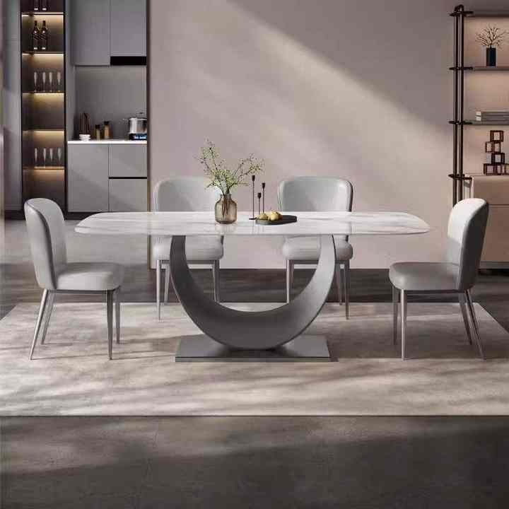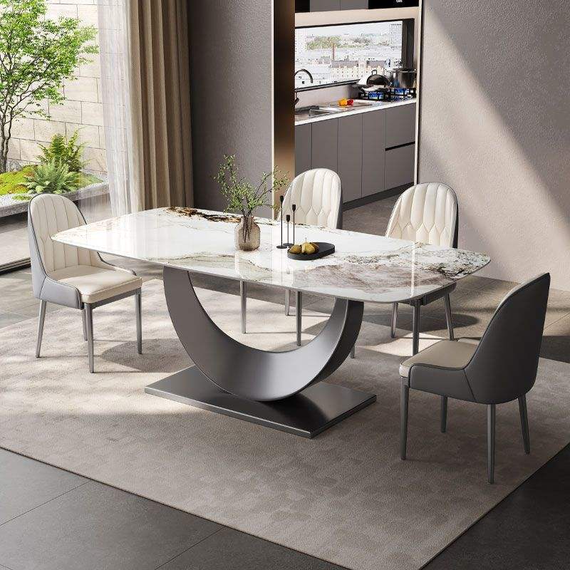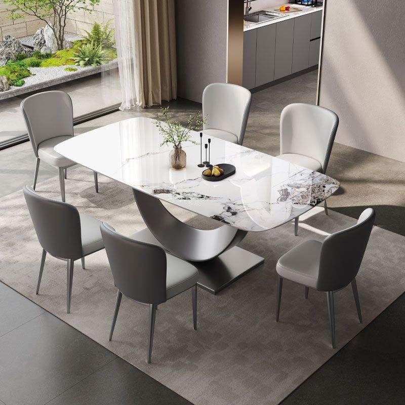 Set Tavolo da Pranzo Moderno con Piano in Pietra Sinterizzata Bianca e Base in Acciaio Inox Spazzolato Nero per Casa e Hotel