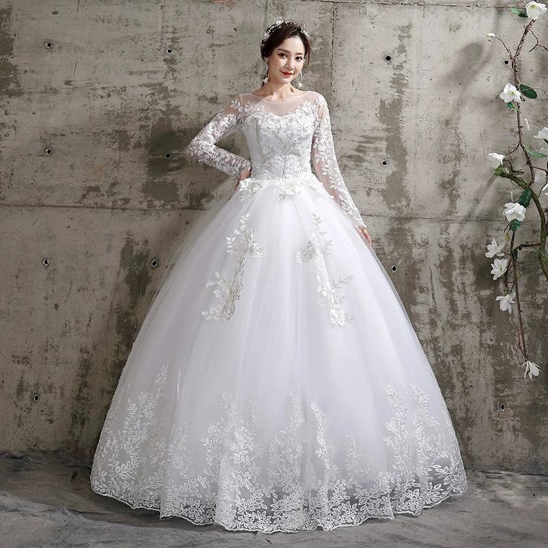 Abito da ballo moderno in pizzo floreale a trapezio per ragazze, abito da damigella d'onore a maniche lunghe, lungo fino al pavimento, con vita scesa, per matrimonio e ballo di fine anno