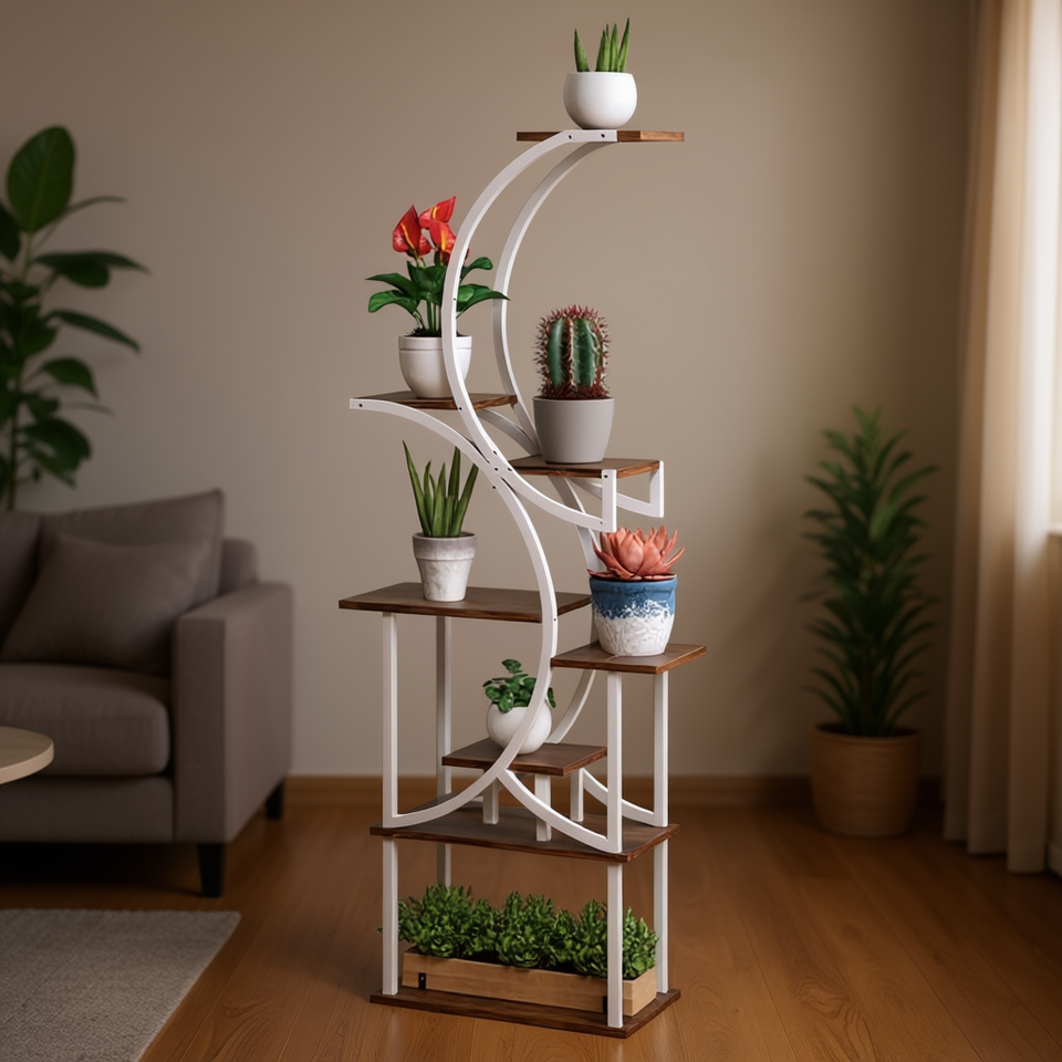 Modern Flower Stand Wood 5 Tier Curve Design Freestanding Plant Display Shelf For Living Room Home Decor