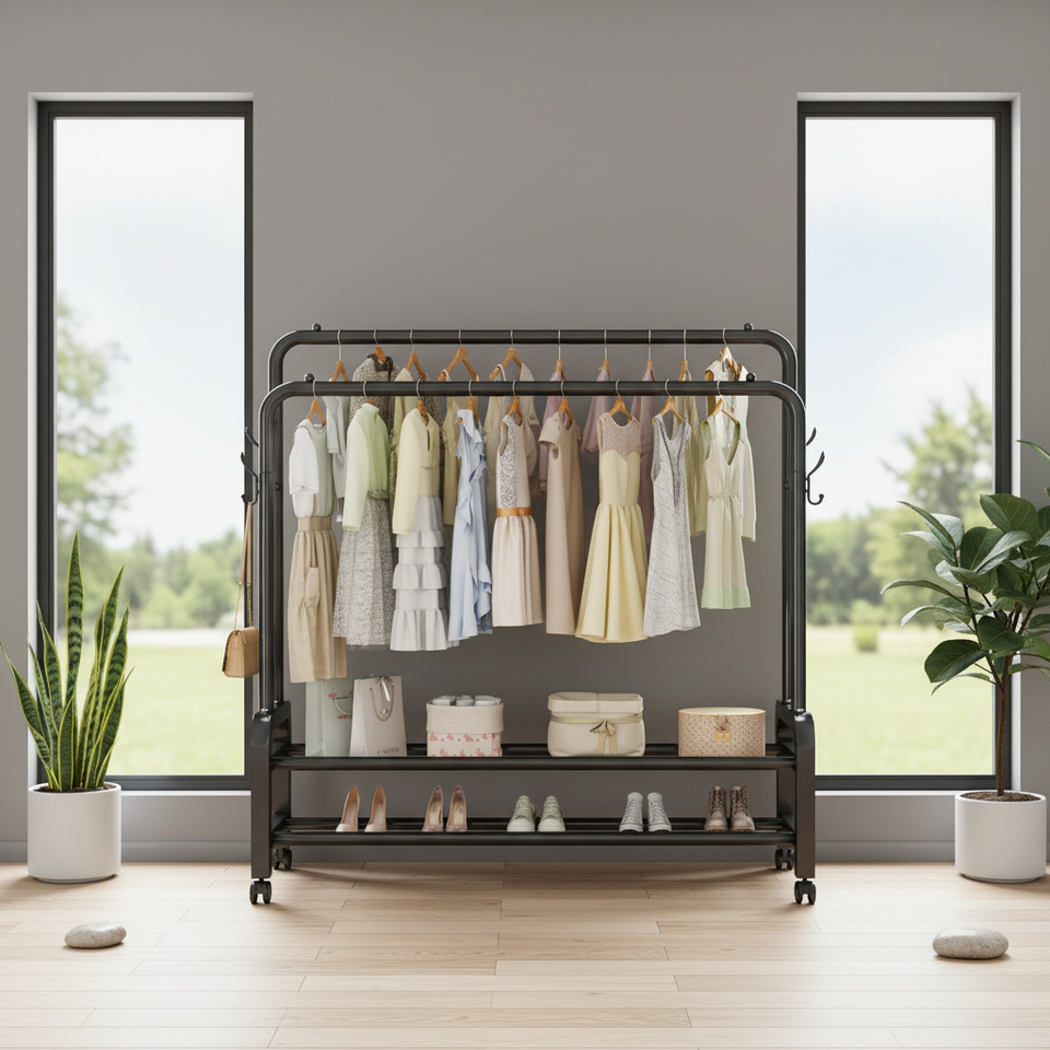 Appendiabiti Moderno Autoportante con Ruote, Struttura in Acciaio Inossidabile, Portatile e Mobile per Uso Alberghiero, con Ripiani per Piccoli Oggetti