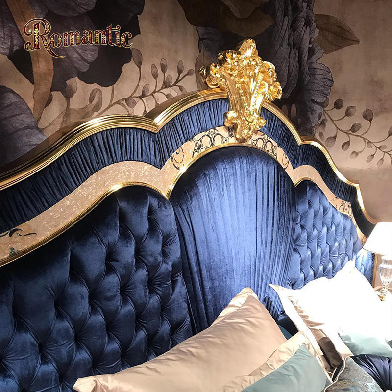 Modern French Luxury Royal Bedroom Adjustable Bed Frame Queen Size Blue Velvet Gold Leaf Decoration Tufted Headboard Assembled