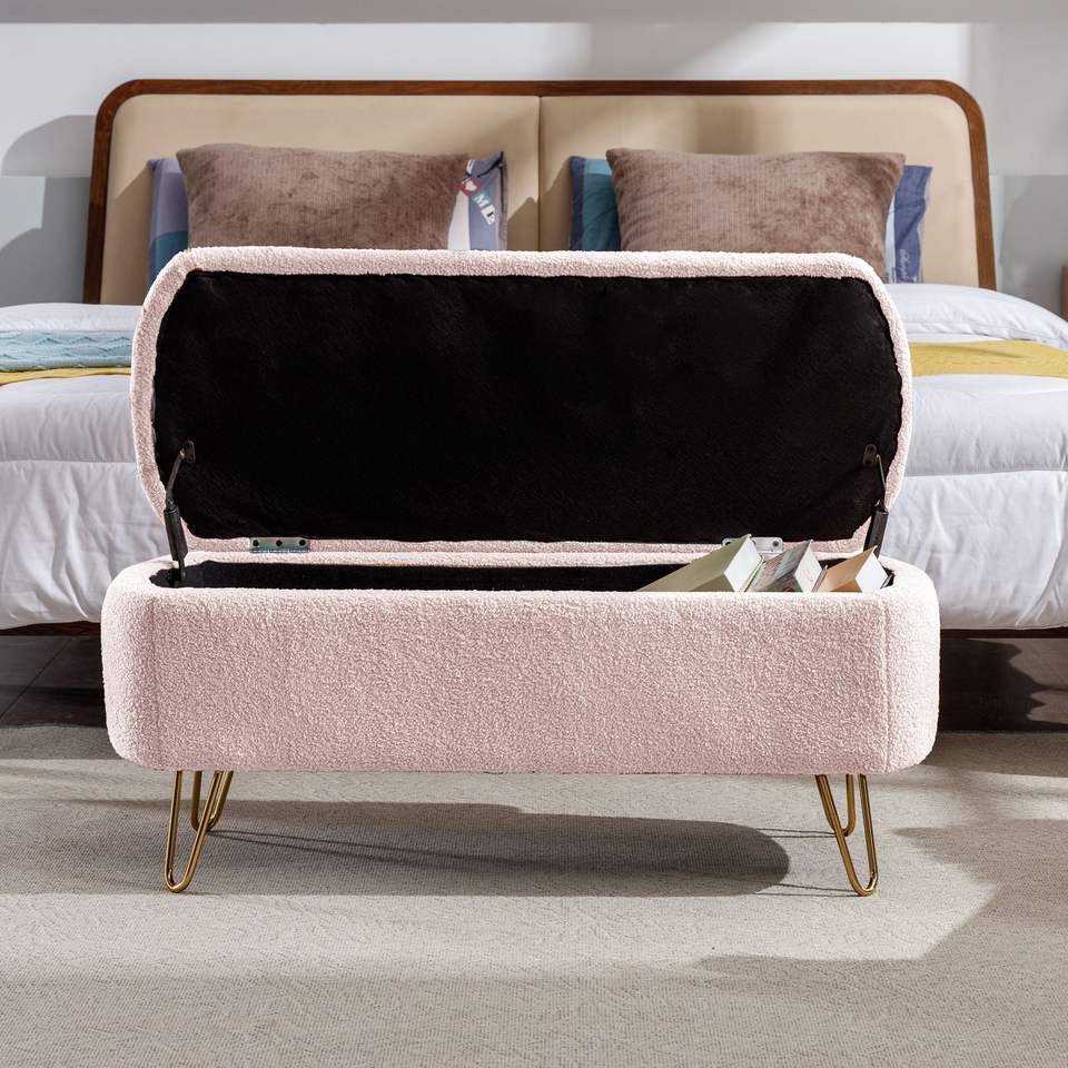 Panca Moderna Grigia in Finta Pelliccia per Ingresso, Panca Contenitore Rosa con Gambe Dorate per Fondo Letto, Letto Imbottito