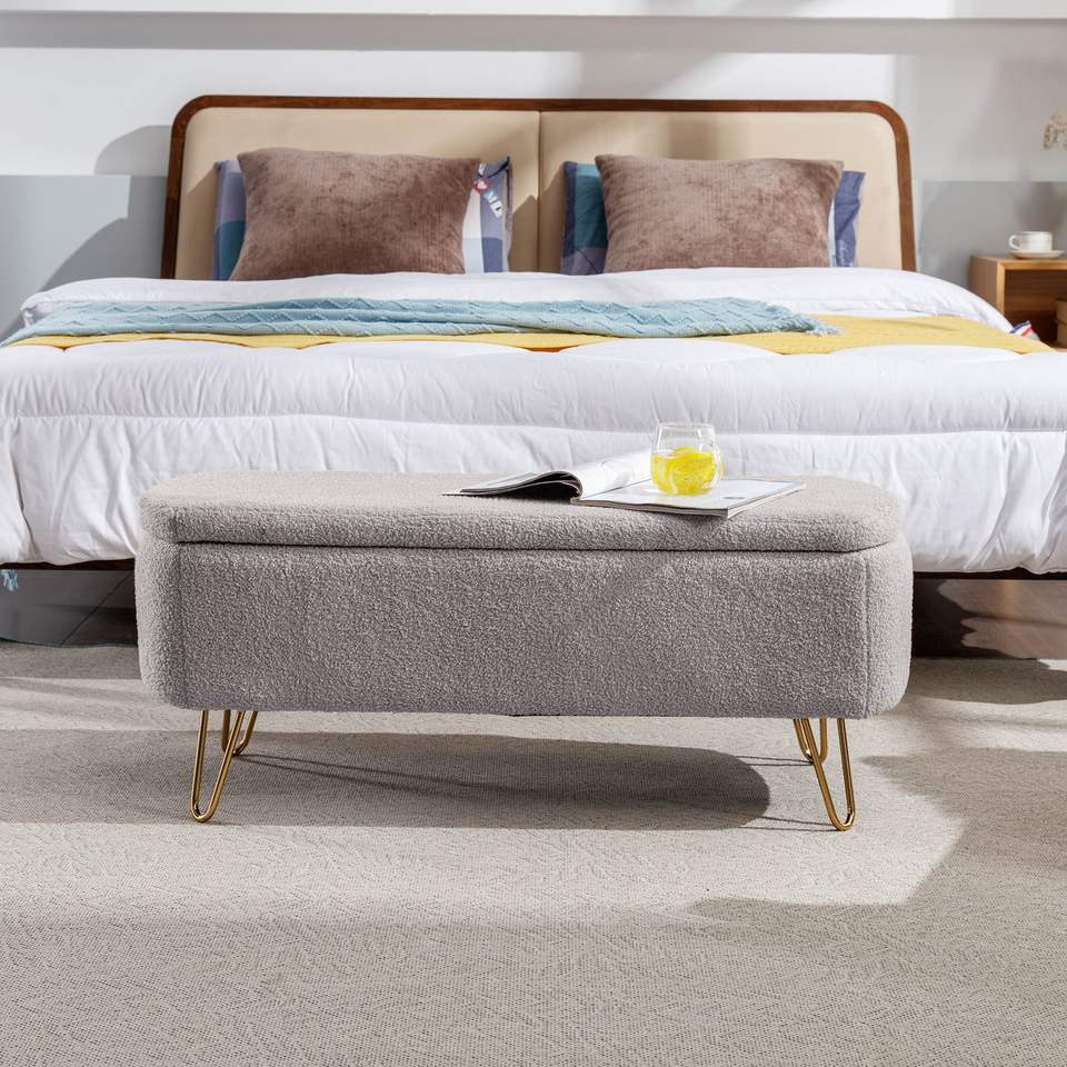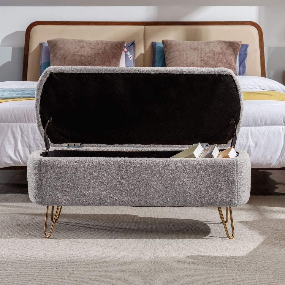 Panca Moderna Grigia in Finta Pelliccia con Gambe Dorate, Pouf Contenitore per Fondo Letto, Sgabello Imbottito ed Elegante