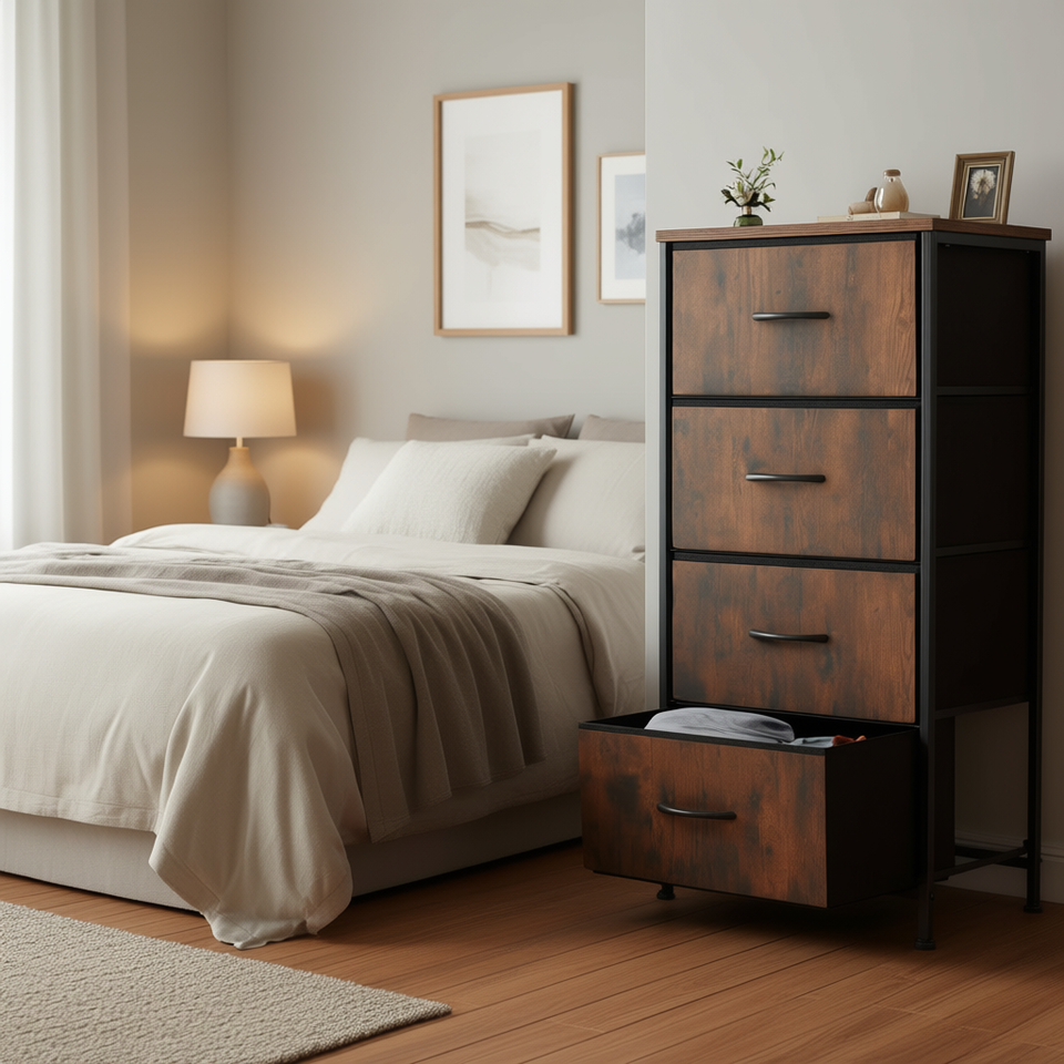 Modern Industrial 4 Drawer Dresser Chest Solid Wood Top Metal Frame Bedroom Storage Furniture Freestanding Design