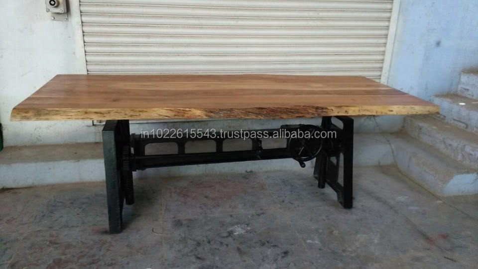 Tavolo da Pranzo Industriale Moderno con Manovella, Lastra di Legno di Acacia con Bordo Naturale per Soggiorno e Arredamento Commerciale