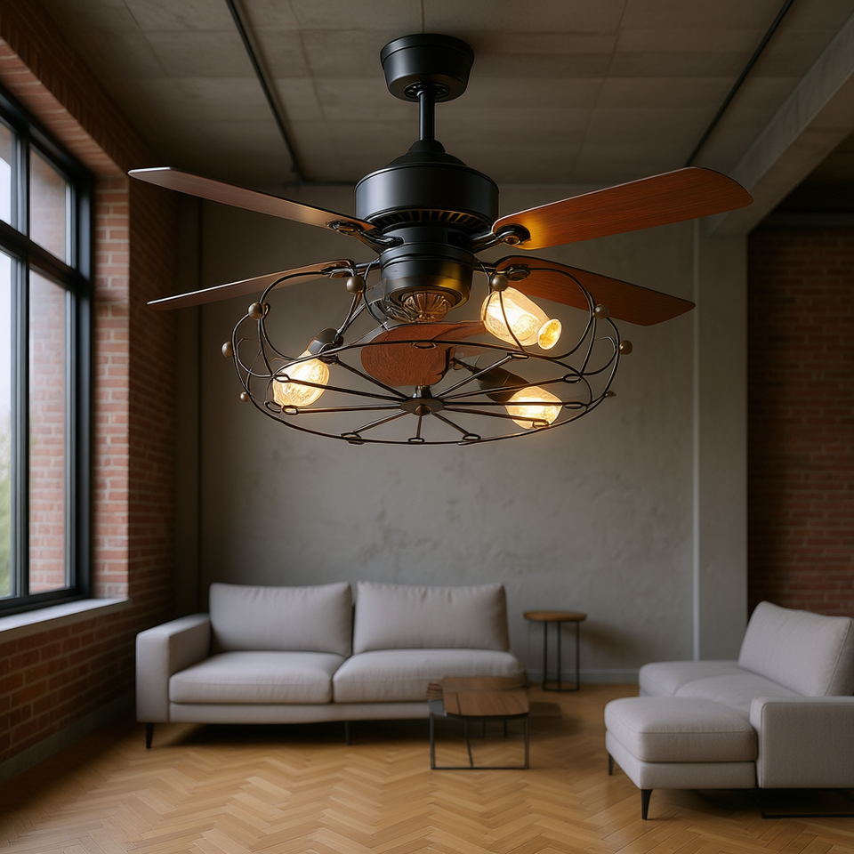 Ventilatore da Soffitto LED Industriale Moderno con Luci, Design a Gabbia a Basso Profilo, Telecomando, 3 Pale, Motore DC, Luce Calda