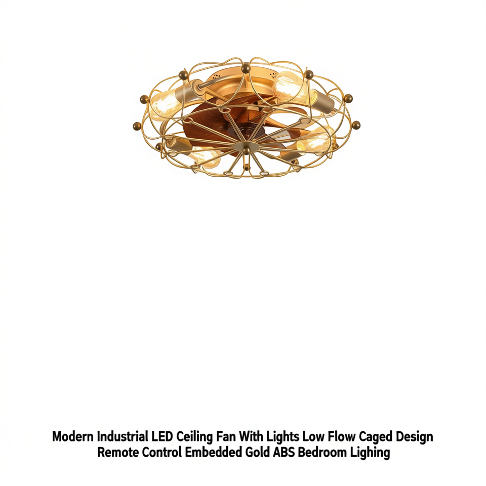 Ventilatore da Soffitto LED Industriale Moderno con Luci, Design a Gabbia a Basso Profilo, Telecomando, Illuminazione Integrata in ABS Dorato per Camera da Letto