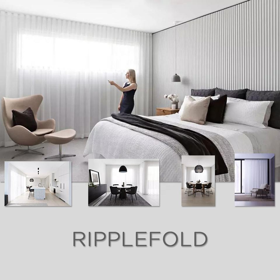 Tenda Moderna in Poliestere con Onde, Inerentemente Ignifuga, Motorizzata Lutron, Oscurante e Trasparente per Soggiorno