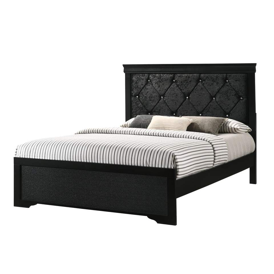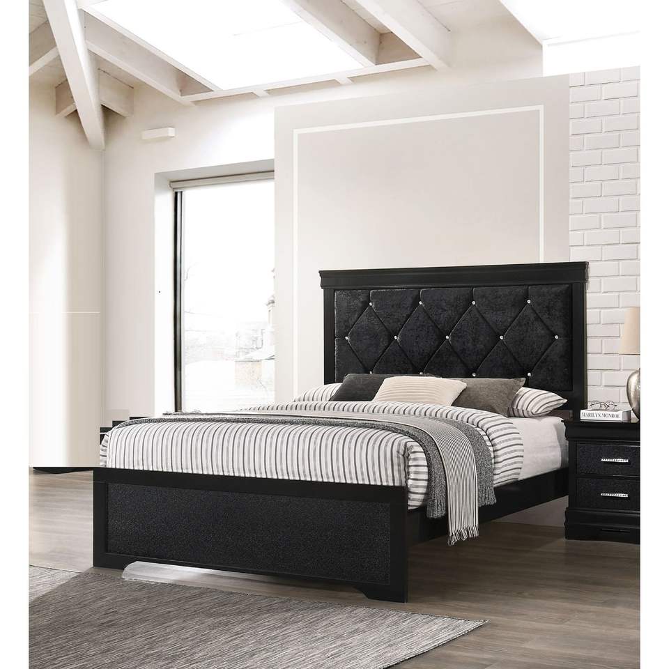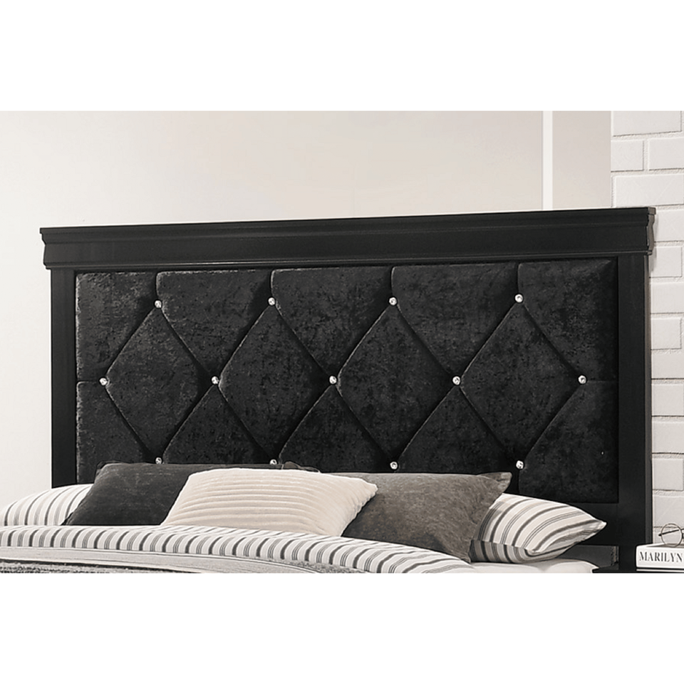 Letto Moderno King Size con Pannello, Finitura Nera, Testiera in Legno e Tessuto Imbottito con Bottoni Trapuntati in Cristallo, Arredamento Camera da Letto