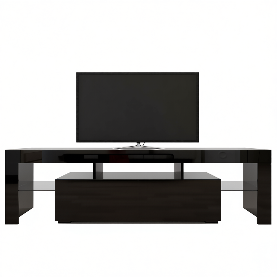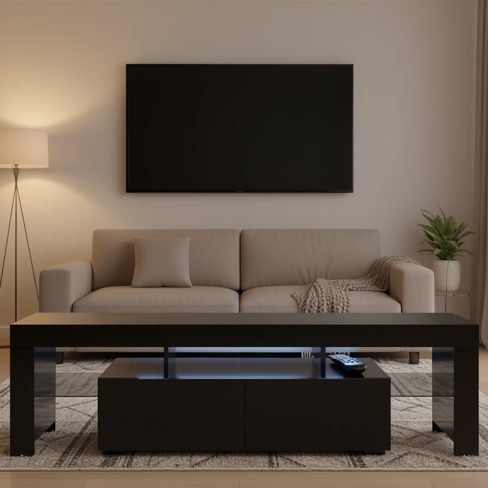 Mobile porta TV moderno a LED nero da 65 pollici e oltre, con ripiano in vetro, supporto da pavimento in legno, mobile da soggiorno