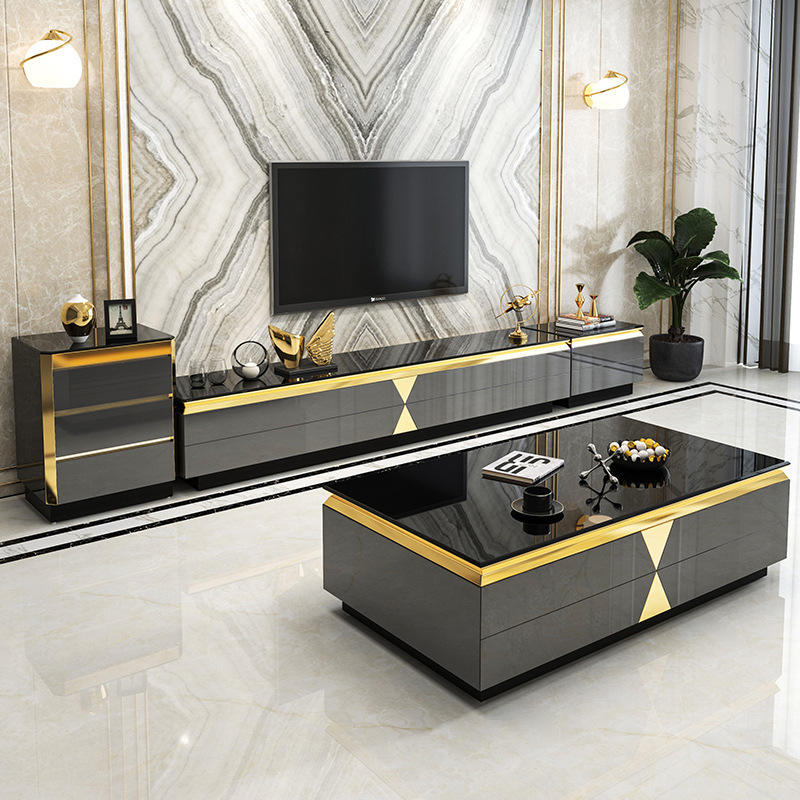 Modern Light Luxury Tempered Glass Gold Marble Coffee Table and TV Cabinet With Drawer Combination for Living Room Furniture