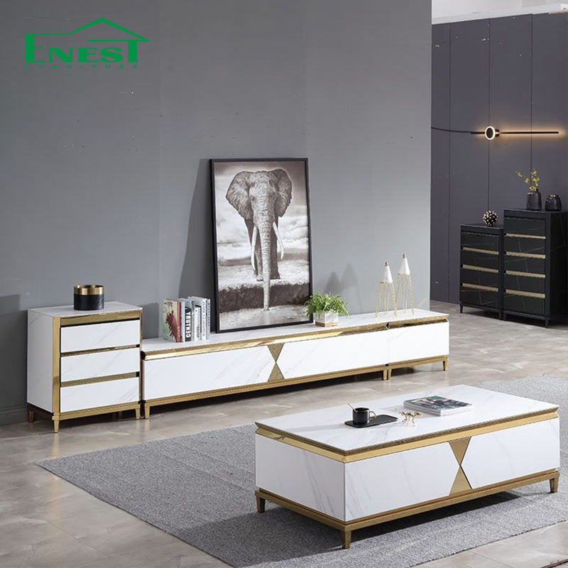 Wooden Tempered Glass Gold Marble Coffee Table and TV Cabinet