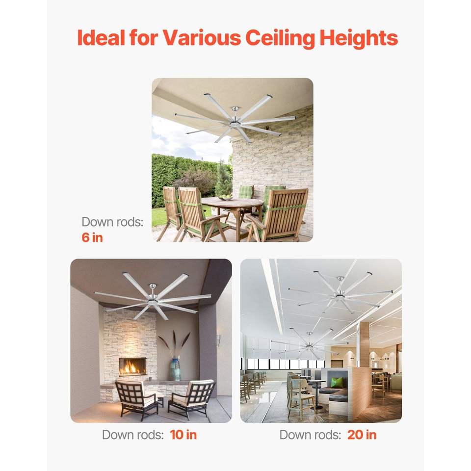Ventilatore da soffitto moderno a basso profilo da 96 pollici con luce, telecomando a 6 velocità, in alluminio, 8 pale, motore DC reversibile
