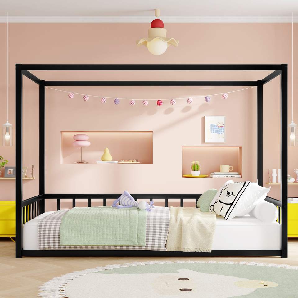 Moderno Letto a Basso Profilo per Letti Singoli e Matrimoniali con Parasole e Sponda di Sicurezza Stile Recinzione per Bambini