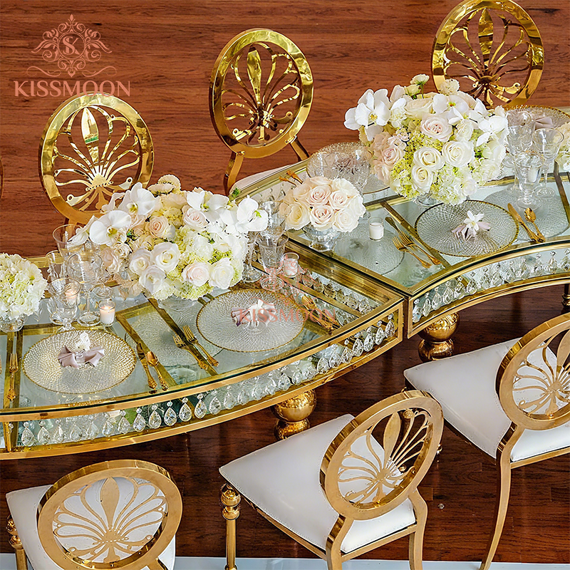Modern Luxury Golden Royal Stainless Steel Frame Tempered Glass Top Crystal Serpentine Wedding Table