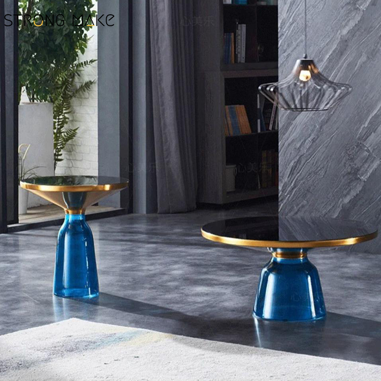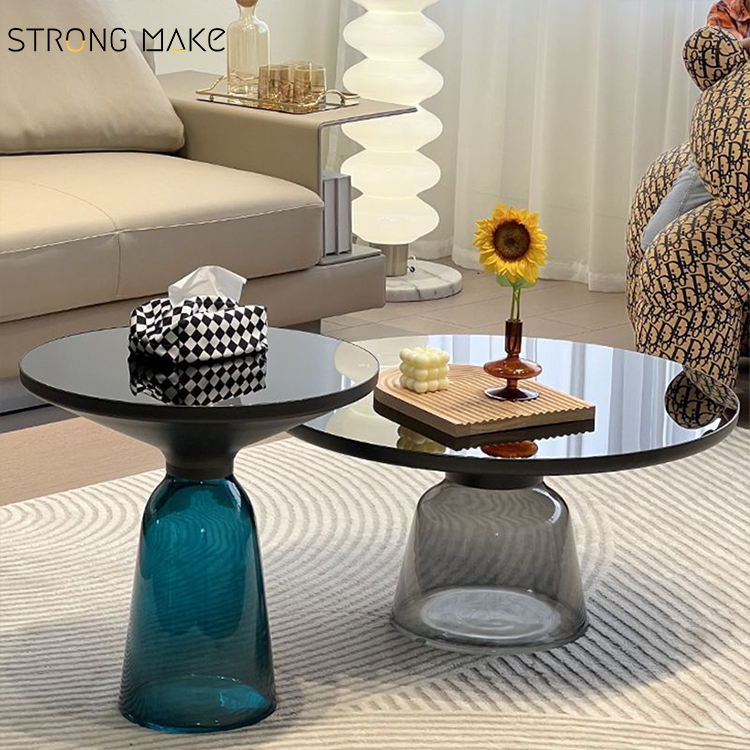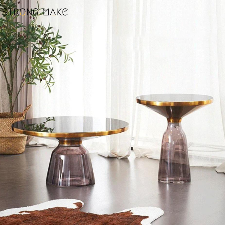Modern Luxury Living Room Furniture Smoked Color Golden Tables Basses Mirrored Bell Round Tempered Glass Coffee Table