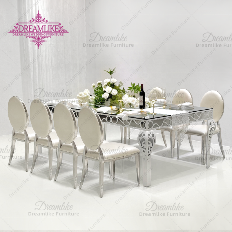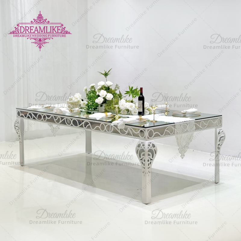 Moderno rettangolo di lusso banchetto specchio di vetro tavolo da pranzo oro o argento in acciaio inox per ristoranti di nozze