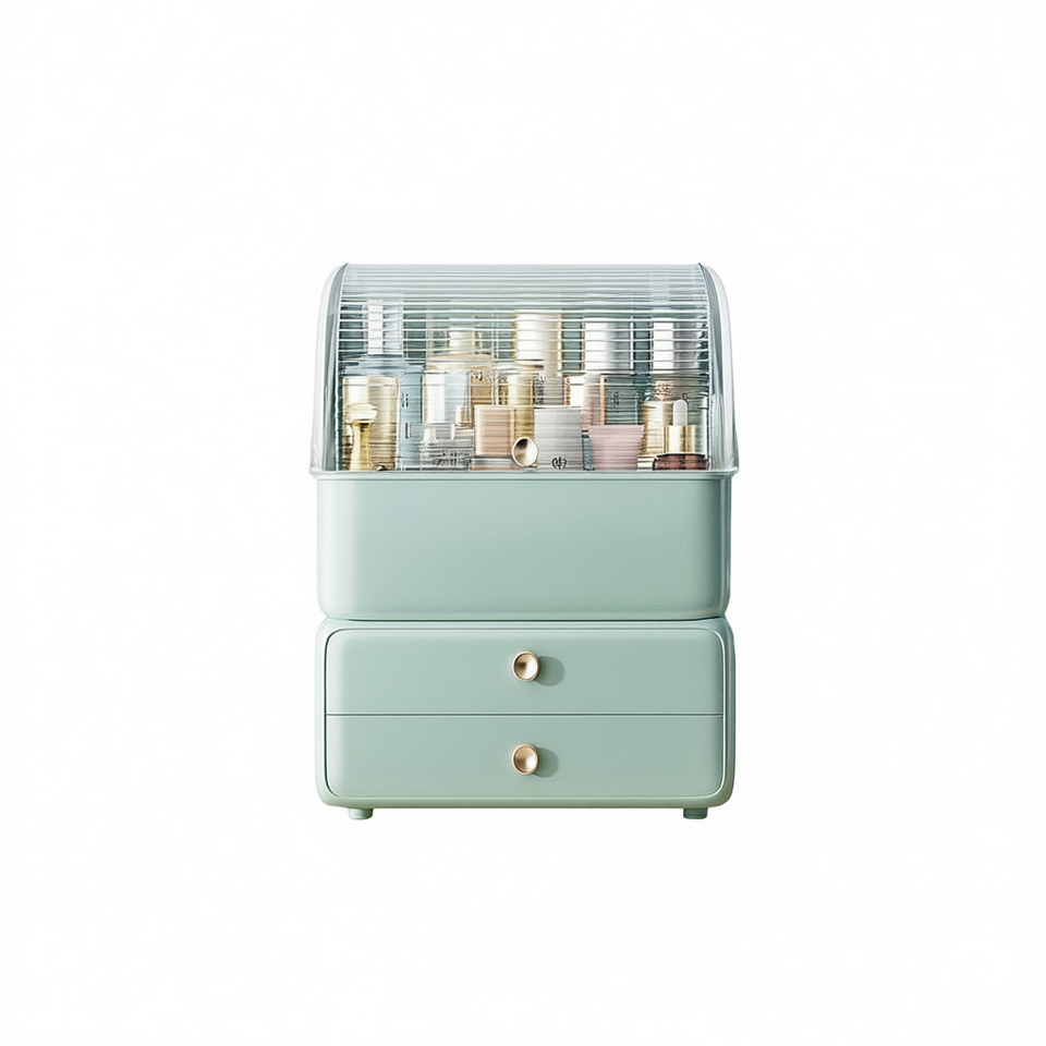 Organizzatore Moderno per Trucchi, Espositore Cosmetico Verde in Plastica Impermeabile, Contenitore da 10-20 L con Cassetto