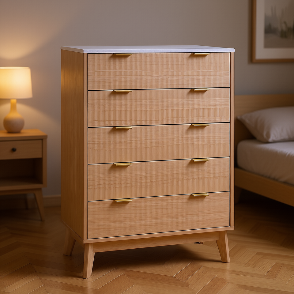 Comò Moderno Minimalista a 5 Cassetti in Legno di Rovere Chiaro, Mobile da Camera da Letto Indipendente