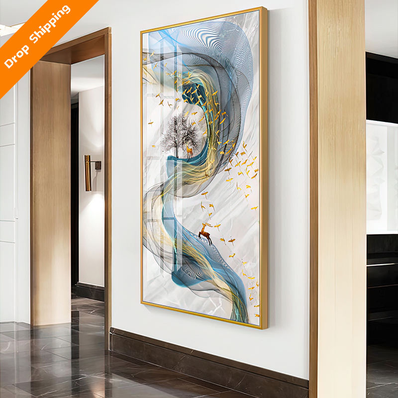 Dipinto Moderno Minimalista Astratto con Linee di Alce, Decorazione per Corridoio, Arte Murale in Tela Nordica con Cristalli e Porcellana