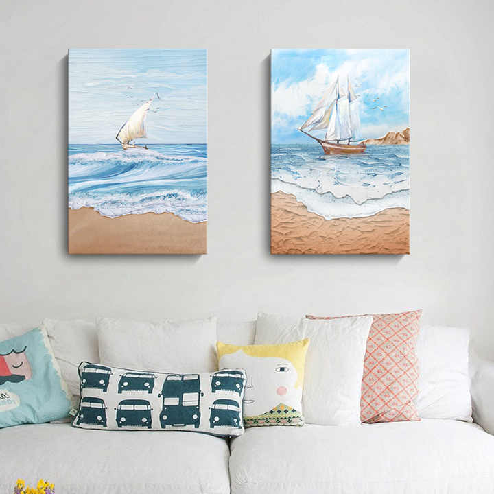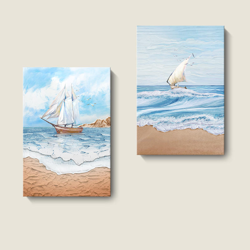 Modern Minimalist Seaside Oil Painting Inkjet Texture Sailing Boat Landscape for Living Room or Restaurant Canvas Support