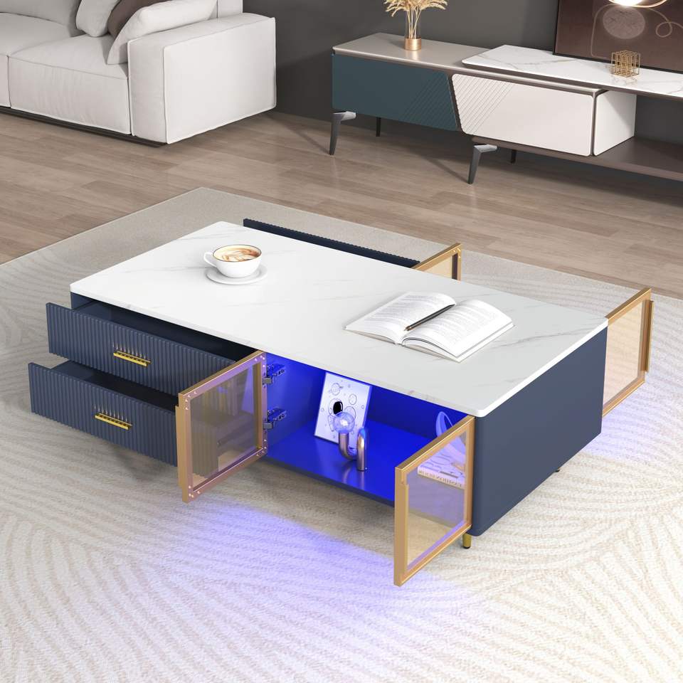 Tavolino da Caffè Moderno Multicolore da 120 cm con 2 Ante in Vetro e 4 Cassetti, Gambe in Metallo Dorato