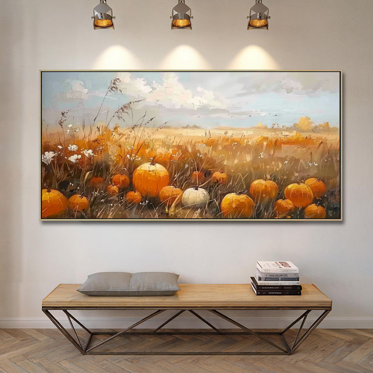 Quadro Moderno Nordico Autunnale Fatto a Mano in Acrilico Ecologico, Dipinto Originale su Tela con Scene di Foglie di Zucca per Soggiorno