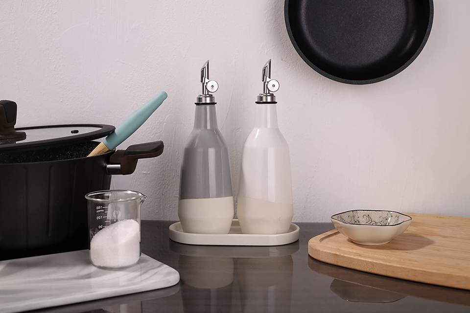 Dispenser moderno per olio e aceto con beccuccio in metallo e vassoio versatore pesante da cucina Dispenser per bottiglie in ceramica Set di 2