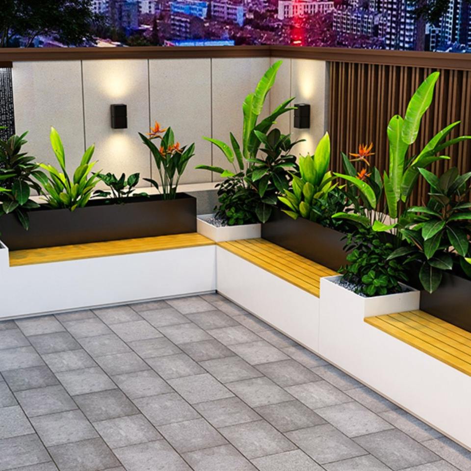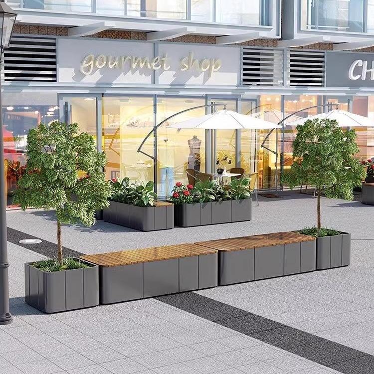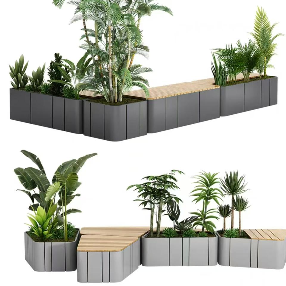 Set Moderno da Esterno in Ferro Battuto con Fioriera in Legno Massiccio e Panchina a 2 Posti per Negozi di Tè e Ristoranti