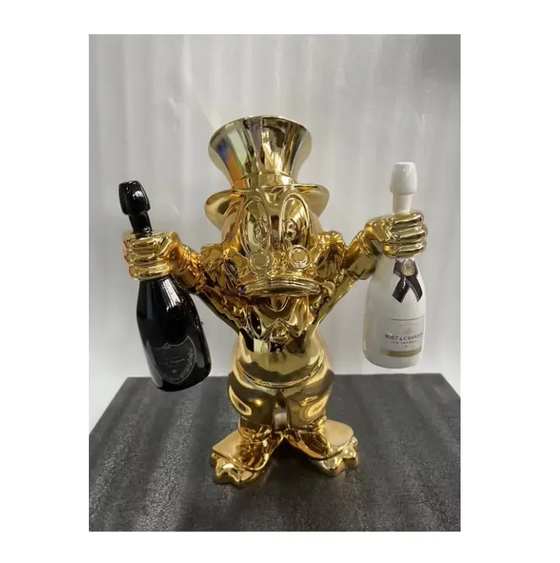 Scultura in Resina Personalizzata Design Pop Art Moderno, Paperino con Due Bottiglie, Stile Folk Art, Statua di Paperino in Fibra di Vetro Color Oro, Souvenir