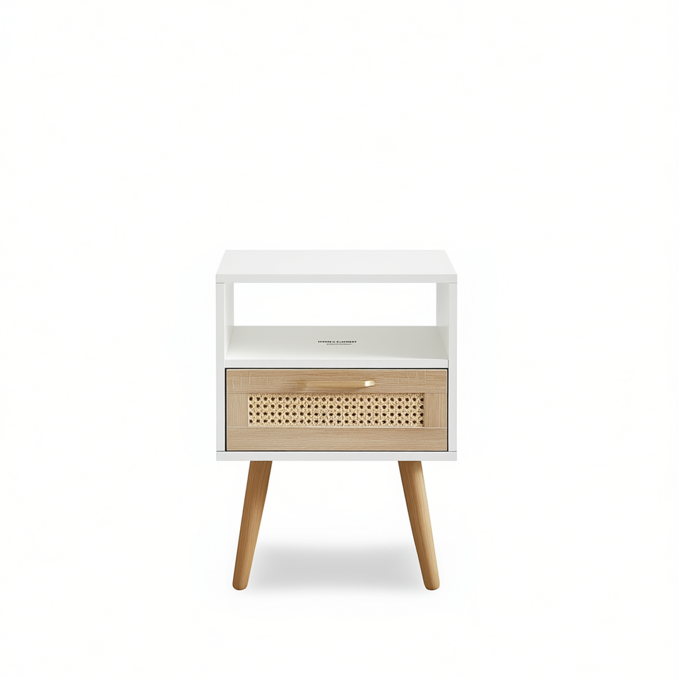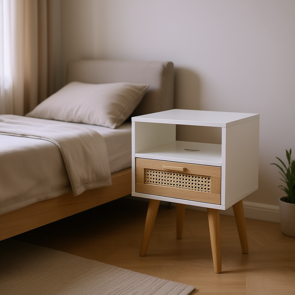 Comodino Moderno in Rattan con Cassetto, Finitura Naturale, Gambe in Legno Massello, Arredamento per Camera da Letto