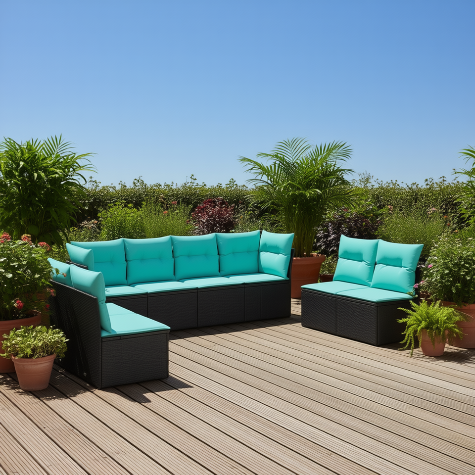 Set di divani da patio in rattan moderno con cuscini color verde acqua per sedute all'aperto, capacità 7 persone, design contemporaneo