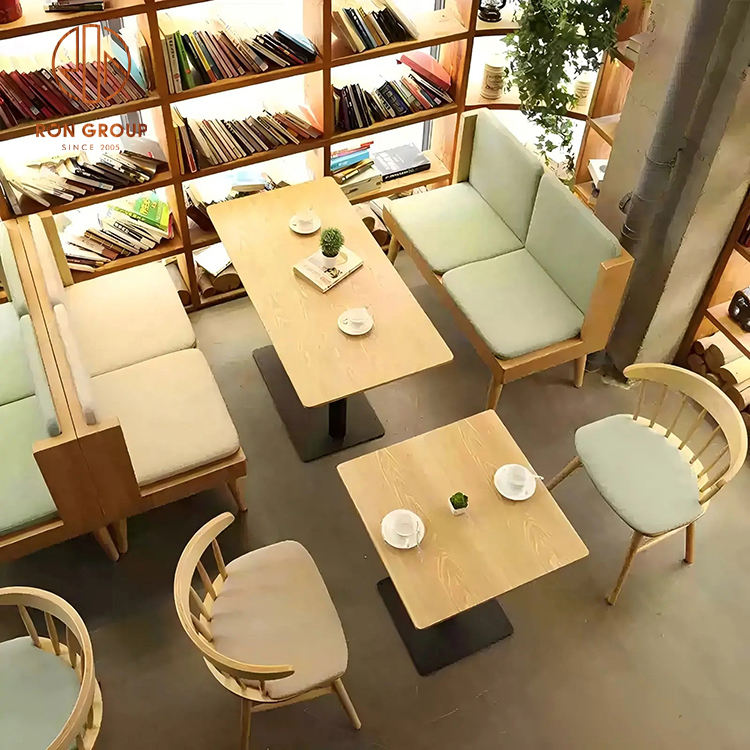 Set di Mobili Moderni per Ristorante Divano in Legno Verde con Tavoli Rotondi in Legno e Sedie in Legno Naturale per Caffetteria
