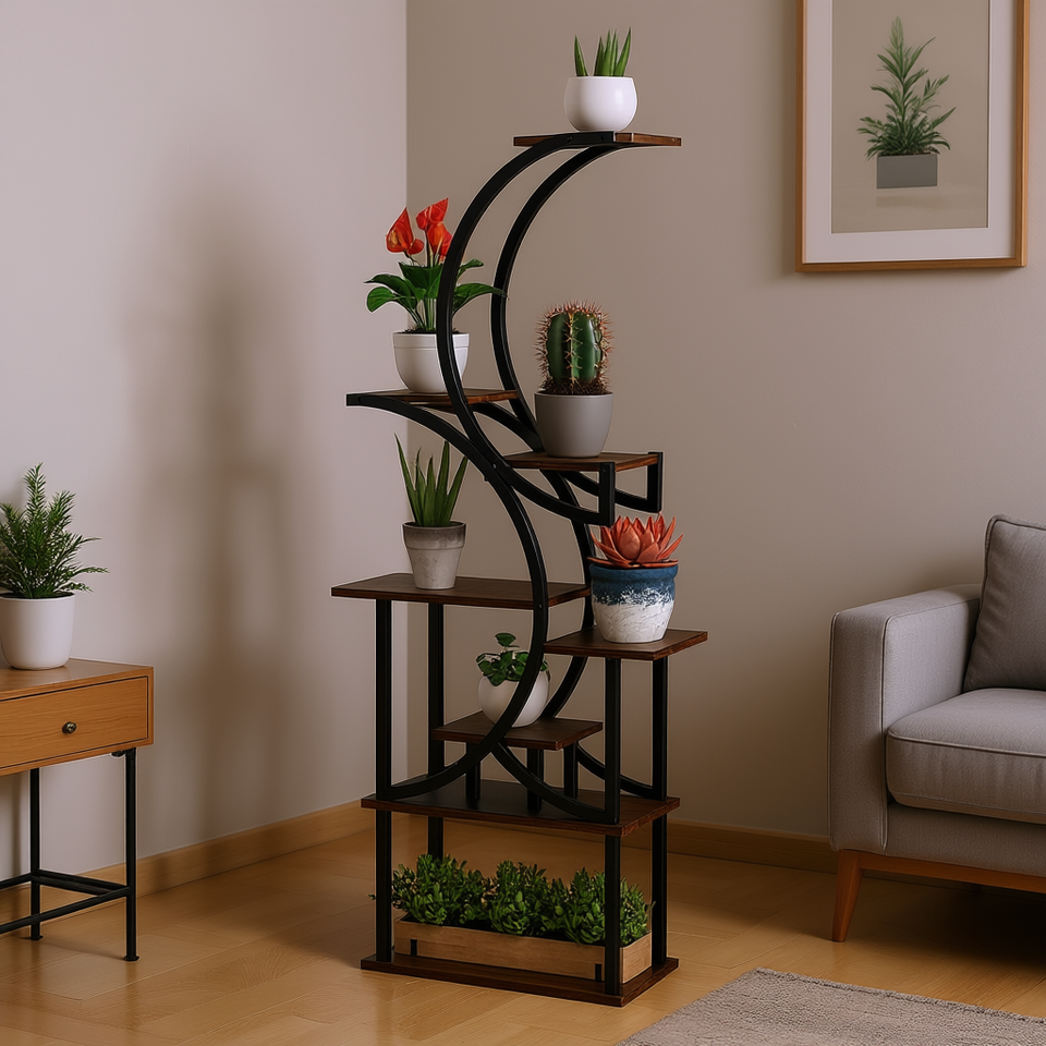 Modern S-Shaped 8-Tier Indoor Plant Stand Carbonised Finish Wall Display Shelf for Living Room Corner Rack