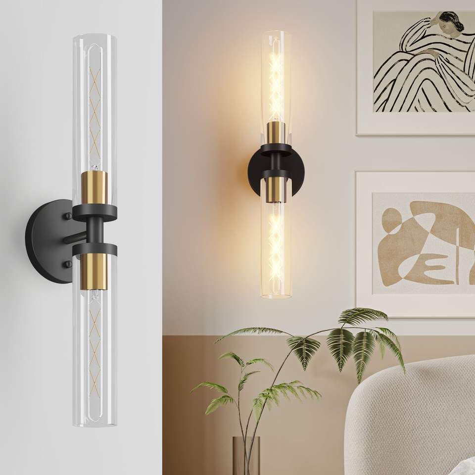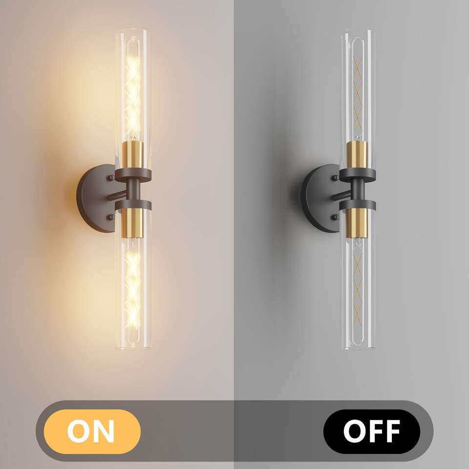 Set Moderno di Due Applique da Parete Nere e Oro, Illuminazione per Bagno con Vetro Trasparente, Elegante Decorazione Murale