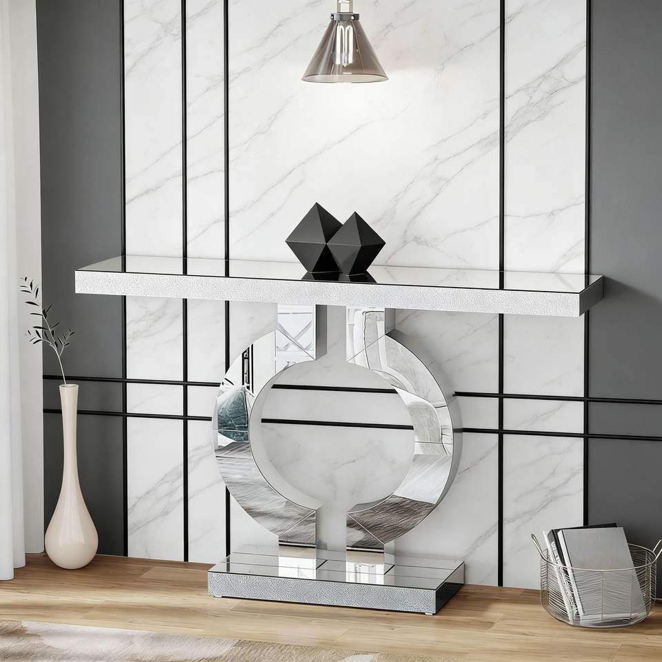 Consolle moderna argentata a specchio con base a O, elegante tavolino da divano