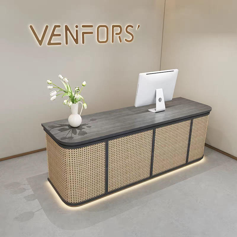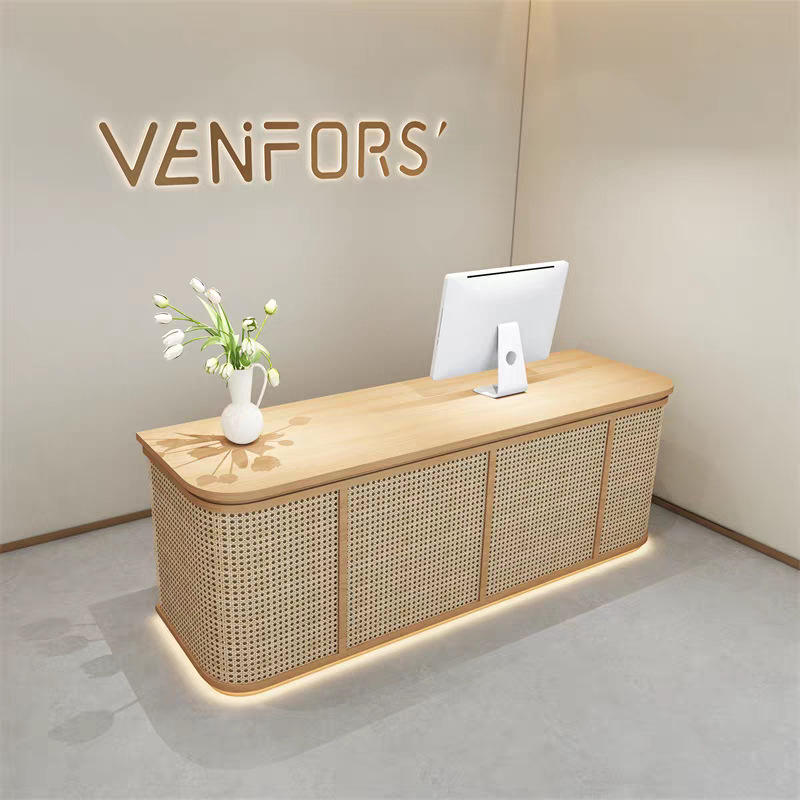 Bancone Moderno in Legno Massello Stile Giapponese con Rattan per Barbieri e Saloni di Bellezza, Tavolo di Ricevimento per Accogliere gli Ospiti